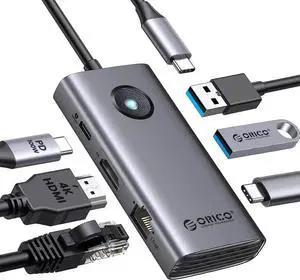 USB C Hub Ethernet Adapter, ORICO 6-in-1 USB C Docking Station with 1000Mbps Ethernet, USB C to HDMI 4K, 100W Power Delivery, 3 USB 3.0 Ports Type C Hub for MacBook Pro, Chromebook and USB C Devices