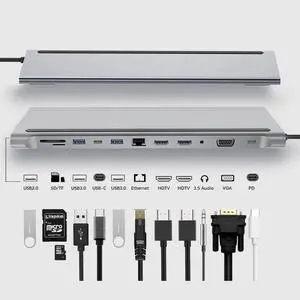 USB C Hub Docking Station 12 in 1 - Dual 4K HDMI/VGA,3 USB Ports, 3.5mm Audio, PD 100W, SD/TF, Ethernet - Laptop Docking Station for MacBook/Dell XPS/More Type-C Devices