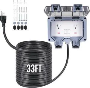Outdoor Power Outlet 15A 110V with 10/20/33ft Extension Cord IP66 Waterproof, IK08 & UL1363-2018 Certified Outdoor Outlet Extender for Garden Garage Patio (33FT)