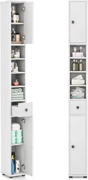 Tall Slim Bathroom Storage Cabinet, 71" Freestanding Bathroom Cabinet w/ 2 Doors, 1 Drawer & 5 Adjustable Shelves, Floor Narrow Tower Cabinet for Small Spaces, 8" x 8" x 71" (White)