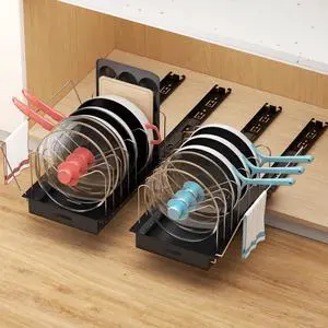 2 Pack Pots and Pans Organizer Under Cabinet, 22" Deep Expandable Pull Out Pot Lid Organizer and Storage with 10 Adjustable Dividers No Drill Pot and Pan Holder Rack with Handle Bracket(Black)