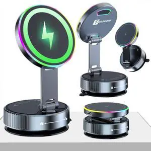 Car Mount Charger 15W Wireless Charger Suction Cup Phone Mount with Breathing RGB Light, 360° Adjustable Vacuum Magnetic Holder for iPhone 17 Pro Max/17 Air/16/15 Plus Gray