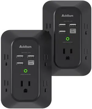 2 Pack USB Wall Charger Surge Protector, 5 Outlet Extender with 4 USB Charging Ports (1 USB C Outlet) 3 Sided 1800J Power Strip Multi Plug Outlets, Wall Adapter Spaced for Home Office, Black