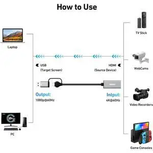 Feature: 4K HDMI Game Capture Card : Game video capture card is designed with high-end smart chip, stylish and compact by decent Aluminum Alloy shell. Supports up to 4K@60fps HDMI input, plug and play let the device work instantly with stream media like OBS/Xsplit. Ideal for live streaming, gaming broadcast, video recording, conference rooms, etc.