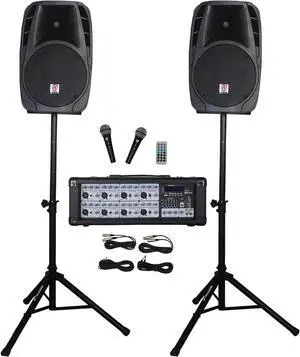 Rockville RPG2X12 Bundle: Dual 12-in 1400W Peak/350W RMS Passive DJ PA Speakers with Stands and Mics, 8-Channel 1400W Powered Mixer with Bluetooth, 2-Items