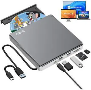 BUNUD External CD/DVD Drive for Apple: USB 3.0 USB-C DVD Burner Player for Laptop Windows 11 with 3 USB and TF/SD Slots Slim Portable Disc Drive with 15W Fast Charger USB Superdrive for Mac Macbook PC