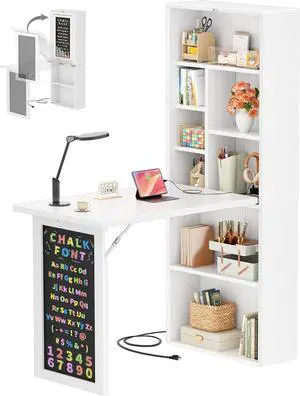 Small Folding Desk with Outlets, Convertible Writing Desk for Small Spaces/Home Office/Craft Room, Multi-Function Desk Workstation with Blackboard, Fold-Out Cabinet Table, White