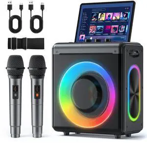 JVFYI Portable Battery-Powered RGB Karaoke for 5.3 Speaker Machine PA System 2 Wireless Microphones for Home Family Singing