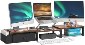 LANDVOI Heavy Duty Dual Monitor Stand, Holds 2 Screens Up to 27 Inches, Adjustable Length and Angle Monitor Riser, Desk Organizer with Side Pockets and Drawers, Home Office Desk Storage, Rustic Brown