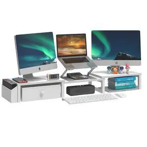 LANDVOI Heavy Duty Dual Monitor Stand, Holds 2 Screens Up to 27 Inches, Adjustable Length and Angle Monitor Riser, Desk Organizer with Side Pockets and Drawers, Home Office Desk Storage, White