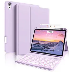 BQDIYOO Case for iPad Air 11-inch M3/M2 (2025/2024), Folio Cover with Pencil Holder for iPad Air 7th 6th 11"/Air 5th 4th Gen 10.9 inch Case with 7-Color Backlit Detachable Bluetooth Keyboard, Purple