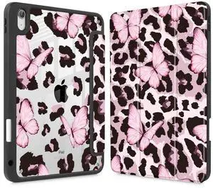Mektron Case for 2025 iPad 11 inch (A16 Chip) 11th Gen Fit iPad 10th Gen10.9 inch 2022, Buit in Pencil Holder with Shockproof Cover Clear Shell + Auto Wake/Sleep, Leopard Pink Butterfly