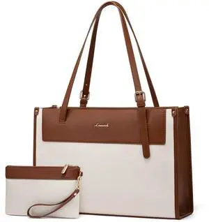 LOVEVOOK Laptop Tote Bag for Women 15.6 Inch Stylish Leather Work Tote Bag Purse Large Capacity And Waterproof Computer Briefcase for Business Office Travel, White-Black, Brown White