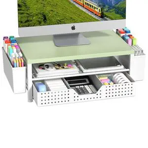 Gugsey Wood Metal Monitor Stand Riser, Laptop Stand for Desk, Office Desk Organizer and Accessories, Computer Desktop Shelf with Drawer and Pen Holder, Printer Stand for Home, Office, Dorm (Green Wood
