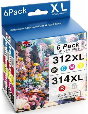 Khotoya 312XL 314XL Ink Cartridges (6-Pack) Compatible Replacement for Expression Photo XP-15000 Printer(1Black,1 Cyan,1 Magenta,1 Yellow,1 Red,1 Gray)
