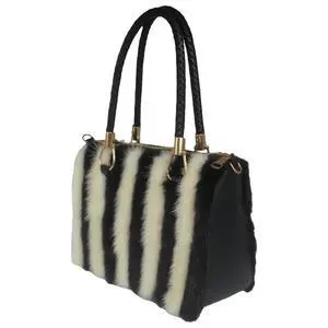 Chunxiao Luxury Natural Mink Fur Handbag with Leather Handle - Medium Size, Ethical Sourcing, 12x7x5 inches (white and blank) (white and black)
