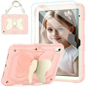 AOKOZZY Case for iPad (A16) 11th/10th Generation 2025/2022 11"/10.9" for Kids Girls with 9H Tempered Glass Screen Protector, Rugged Shockproof Protective with Butterfly Stand, Carrying Strap-Rose Pink