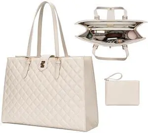 BAGOK Quilted Laptop Tote Bag for Women,15.6" Work Bag,Large Capacity Shoulder Handbag for Business,Office,Travel,Daily UseOff White