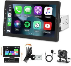10.4" Single Din Touchscreen Car Stereo with Wireless Carplay& Android Auto, Adjustable Car Radio with Bluetooth, Mirror Link, FM Radio, Subwoofer, SWC, Backup Camera