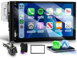 Double Din Car Stereo with Carplay&Android Auto,7 Inch HD Touchscreen Car Radio Support CD DVD Player,Bluetooth,Backup Camera,Mirror Link,SWC,Subwoofer,USB/TF/AUX Input, AM/FM Car Stereo Receiver