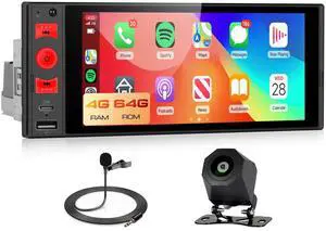Single Din Car Stereo with Wireless Carplay&Android Auto,6 Inch 1 Din Touchscreen Car Radio with Bluetooth FM Radio USB/Type-C SWC Car Multimedia Player+Backup Camera