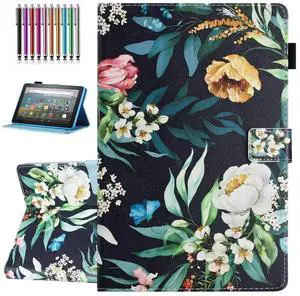YUNHOTIC Case for Fire HD 8 & 8 Plus (12th/10th Generation, 2024/2022/2020 Release), Pen Holder, Premium PU Leather Stand Cover with Smart Auto Wake/Sleep, Peony