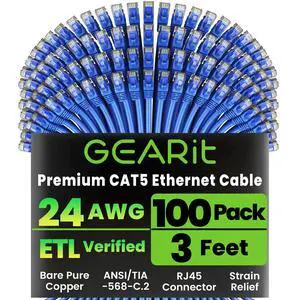 GearIT 100-Pack, Cat5e Ethernet Patch Cable 3 Feet - Snagless RJ45 Computer LAN Network Cord, Blue - Compatible with 48 Port Switch POE Rackmount 48port Gigabit