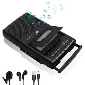 Cassette Player & Tape Recorder with USB Lapel Microphone - Portable USB Player & Tape to MP3 Digital Converter with Headphone Jack, Dual Power (AC/Battery), Retractable Carry Handle-Black