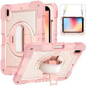 Dteck for iPad A16/10th Generation 2025/2022,360 Rotate Hand Strap/Stand Full-Body Drop Rugged Protective Case with Shoulder Strap Kids Case for iPad 10th Generation iPad 10.9 Inch 2022,Rosegold