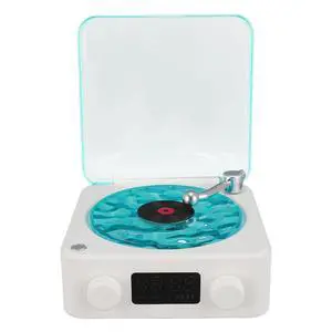 Record Player Speaker, 3 in 1 Small Stereo Wirelessly Speaker with Night Light and Time Display, Multifunctional Bluetooths Speaker for Office Home Decoration (White)