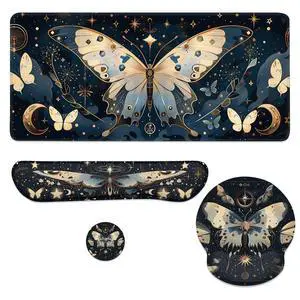 Celestial Night Mouse Pad Set Golden Starry Butterfly Gaming Mousepad 4in1 Desk Mat for Desktop Wrist Support Cup Coaster Set Ergonomic Computer Desk Arm Wrist for Decor Home Office