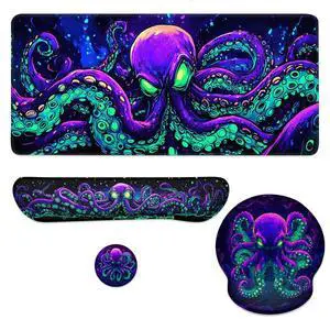 Octopus Mouse Pad Set Cool Neon Purple Green Cthulhu Monster Gaming Mousepad 4in1 Desk Mat for Desktop Wrist Support Cup Coaster Set Ergonomic Computer Desk Arm Wrist for Decor Home Office