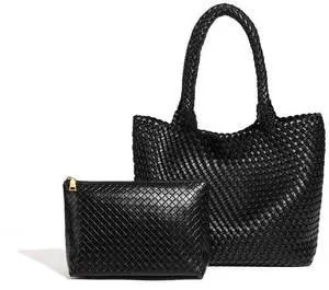 Woven Tote Bag,Woven Purse for women, Vegan Leather Satchel Handbags with Pouch,Large Capacity, Valentine's Day gifts for girl, black