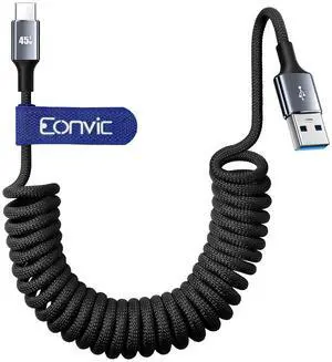 Eonvic USB A to USB C 45W Fast Charging CarPlay Cable Data Transfer Braided Coiled Cable for iPhone 15/16 Pro Max Galaxy S24/S23/S22 Laptops Camera (Black, Coiled 40cm)