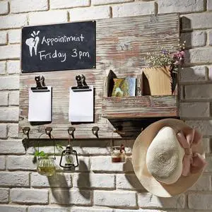 MyGift Wall-Mounted Torched Wood Entryway Organizer, Key Hook Rack with Chalkboard, Memo Clips, Mail Sorter and Hanging Hooks