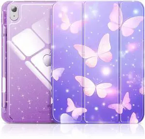INFILAND Compatible with iPad 10th Generation Case, iPad Case 10th Generation 10.9 Inch, Glitter Leather Cover with Sparkly Crystal Clear Back, Pencil Holder, Anti-Yellowing (Purple Flutter)