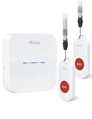 AIDA Wireless Caregiver Pager, 2 SOS Call Buttons/1 Plug-in Receiver, 600 feet Range, 58 Chimes, 5 levels and up to 110dB Volume, for Home Pager Nurse Call Seniors Elderly Patients Children Emergency