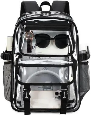 Large Clear Backpack For Women Men Girls 16 inch Laptop School Bookbag Heavy Duty PVC Transparent Backpacks for College Work Travel See Through Back Pack for Sport Events Stadium, Black