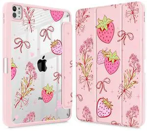 May Chen Case for iPad Pro 11-Inch M5/M4 2025/2024 (6th/5th Generation), Clear Transparent Print Back Shell Slim Stand Shockproof Tablet Cover, Auto Wake/Sleep, Strawberry Bow