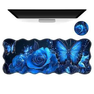 Tudguiloae Large Gaming Mouse Pad with Coaster, Edge Stitching Keyboard Blue Rose Butterfly Mouse Mat for Desk, 31.5" x 11.8" Household Extended Desk Pad for Desktop, Non-Slip Rubber Base