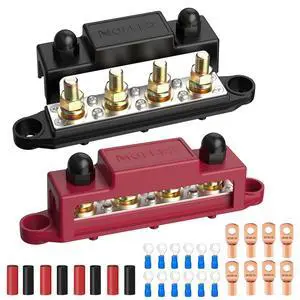 MOFEEZ Power Distribution Block Bus Bar, 4 x 5/16" Post Marine Bus Bar Battery Busbar Terminal Block with Cover, Lugs, Ring Terminals (Pair, Red & Black)