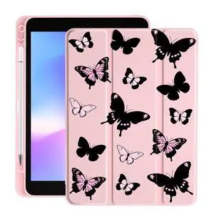LuGeKe Pink Butterfly Case for iPad 5th/6th Generation Unique Case,Pencil Holder & Clear Acrylic Back & Trifold Stand Cover for Women
