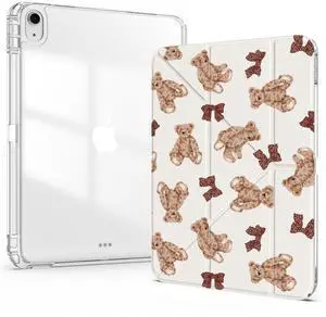 Idocolors Cute Case for iPad (A16) 11th Gen 2025 11-inch/10th Gen 2022 10.9 inch 2022, Clear Acrylic Back Case with Pencil Holder, Detachable Mutil Angles Folding Y-Shaped Stand Cover, Teddy Bear
