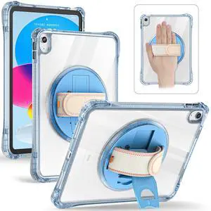 Shockproof Case for iPad 10th Generation 2022 10.9" with Adjustable Shoulder Strap, 360 Rotating Hand Strap Kickstand, Full Body Protection, Clear Back for Customization, TPU PC Cover, Light Blue