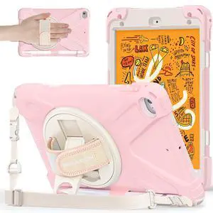 BRAECNstock Kids Case for Apple iPad mini 5/4 7.9" 2019/2015, Shockproof Protective with Pencil Holder, Rotating Stand & Hand Strap,Shoulder Strap, Case for iPad mini 5th/4th Gen, Sakura Pink