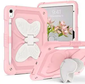 YINLAI Case for iPad (A16) 11th Generation 11 Inch 2025, iPad 10th Generation 10.9 Inch 2022 with Pencil Holder Butterfly Kickstand Soft Silicone Hard PC Girl Kids Shockproof Protective Cover, Pink
