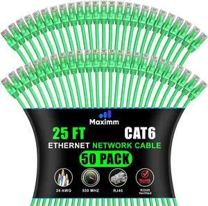Maximm Cat 6 Ethernet Cable 25 ft (50-Pack) - High-Speed LAN, Internet, Patch, and Network Cable - UTP, 10Gbps, 550MHz Ethernet Cord - Green