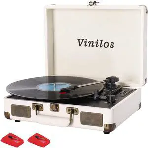 Vinyl Record Player with Bluetooth and Built-in Speakers, 3-Speed Portable Turntable for Vinyl Records, Retro Suitcase Design, USB Recording, Includes Extra Stylus, Ideal for Beginners(White)-Vinilos