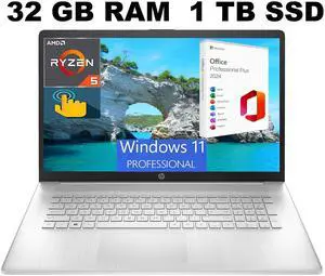 HP 17 Laptop, 17.3" HD+ Touchscreen, AMD Ryzen 5 7530U (6-Core) Processor, AMD Radeon Graphics, 32GB DDR4  1TB PCIe SSD, Wi-Fi 6, Bluetooth, Webcam, Windows 11 Pro ,Office 2024 License
