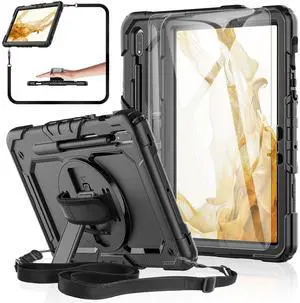 BASE MALL Case for Samsung Galaxy Tab S8/S7 11-inch 5G Tablet Case 2022/2020, [with Tempered Glass Screen Protector],360 Rotating Kickstand/Hand & Shoulder Strap/S Pen Holder (Black)
